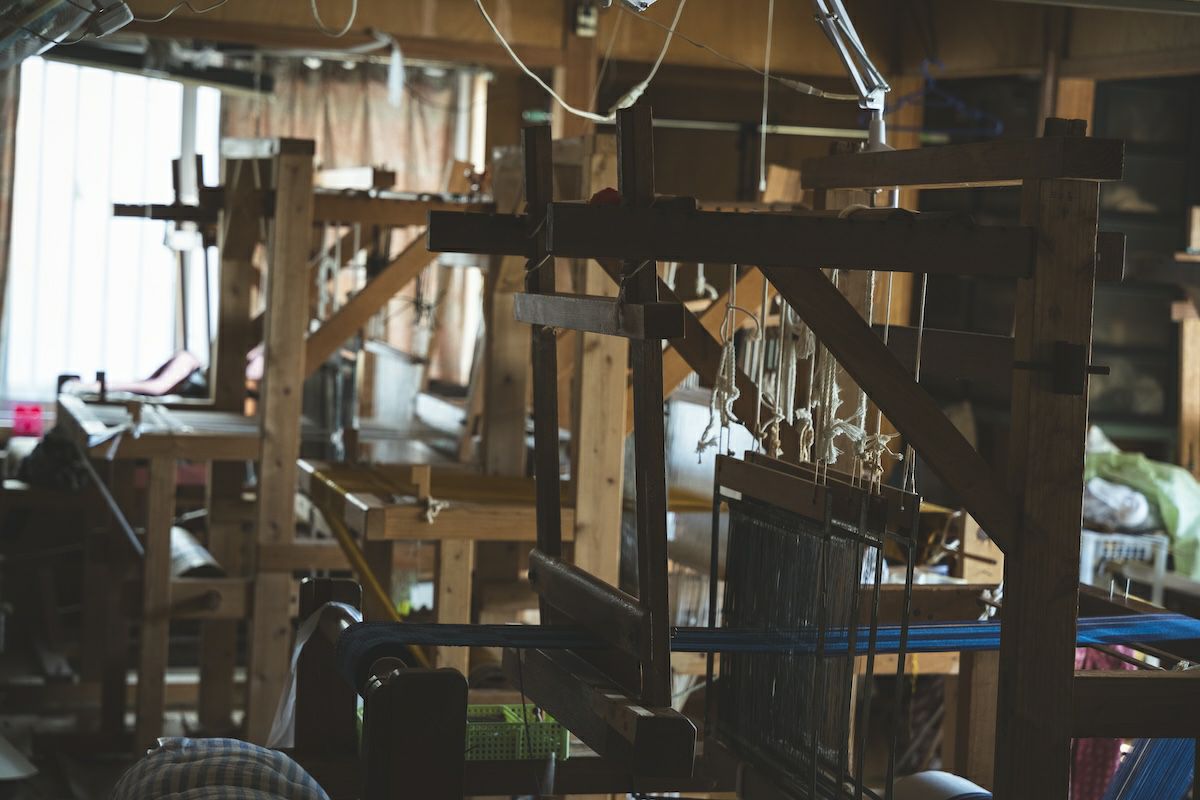 沖縄の伝統的な織物、絣(かすり)の文様をイメージしました。約600種類あるとされる図柄を組み合わせ、多彩な布が織られています。紺地は深い藍色をベースに、鳥や雲などの図柄を織物で表現しています。