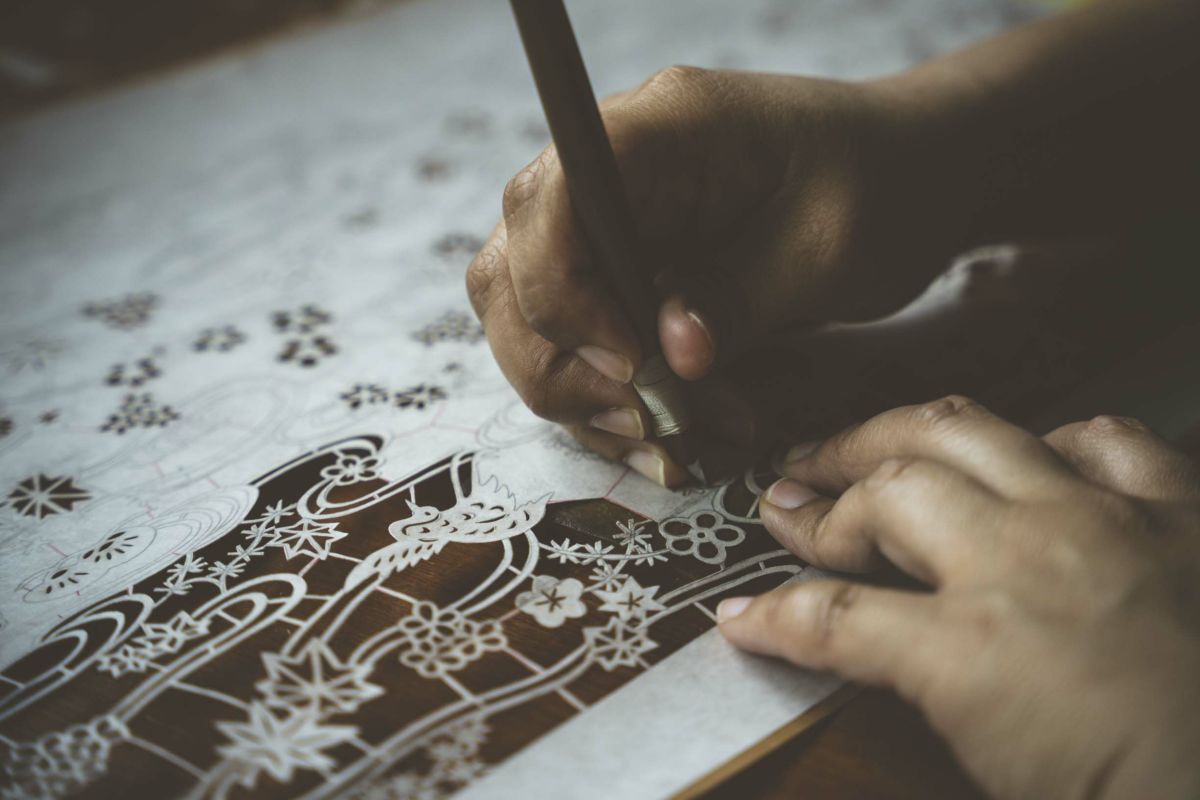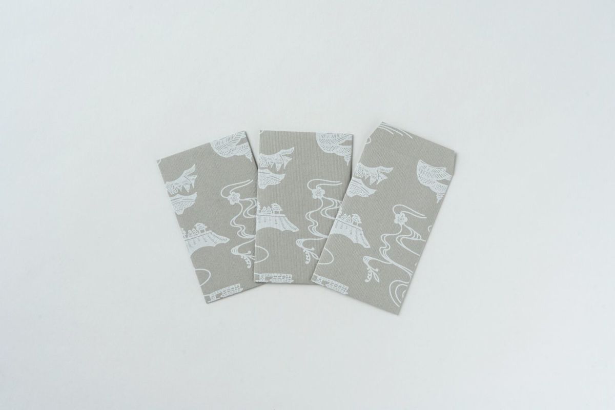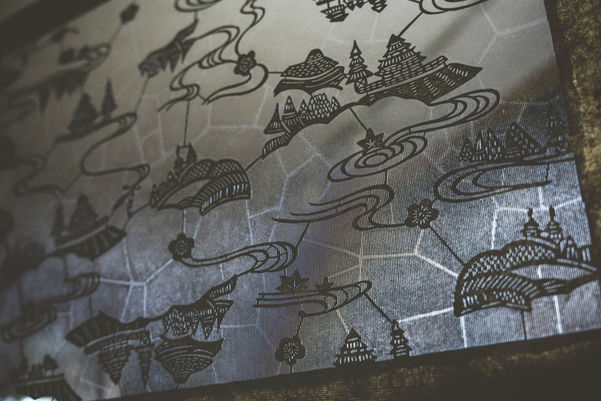 沖縄の伝統的な染物、紅型(びんがた)の文様をイメージしました。大和模様のほか、東南アジアや中国の要素もありながらも、琉球らしさを感じさせる紅型のデザイン。かつての琉球を思わせる風景が描かれています。