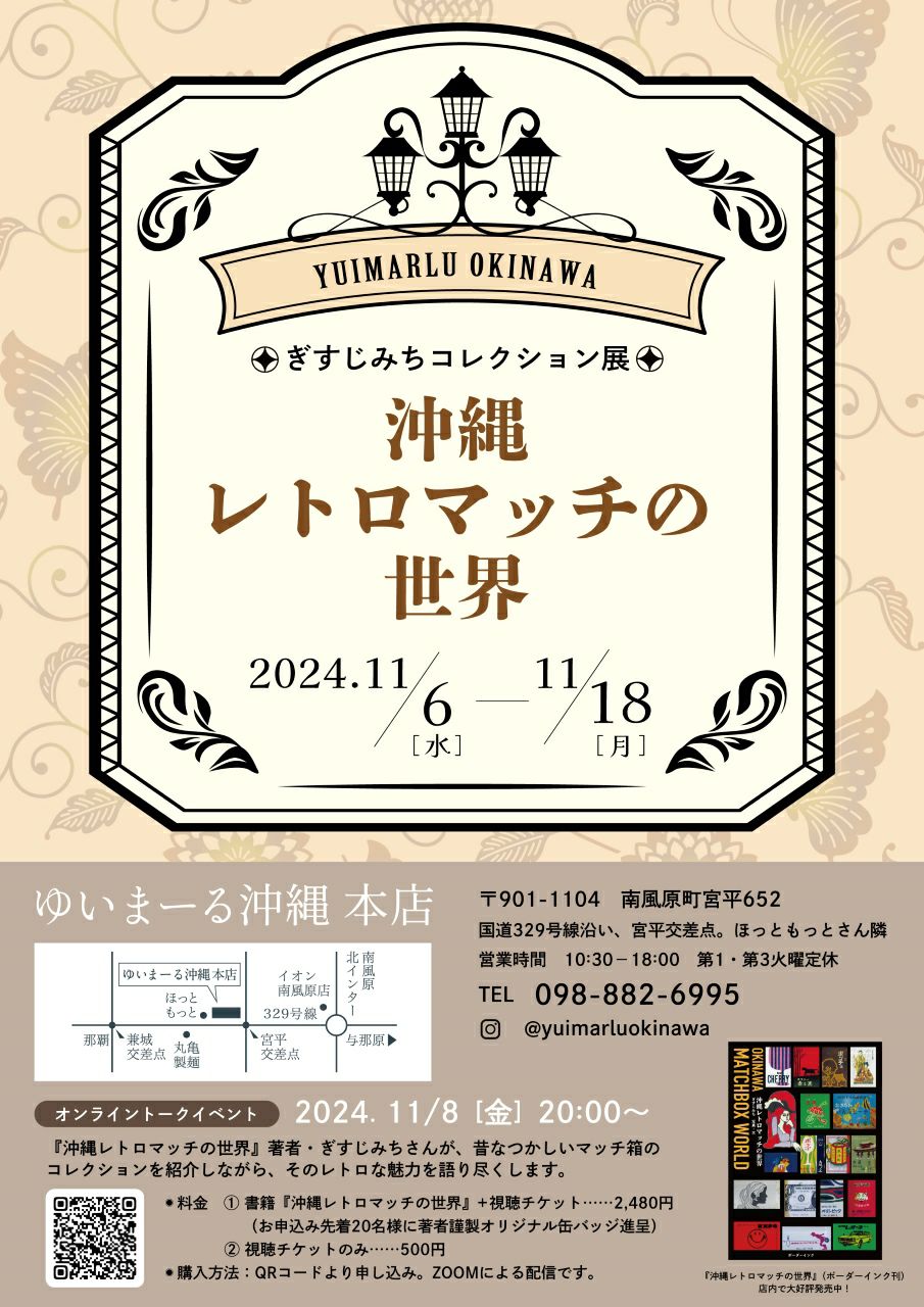 他の画像を見る 【アーカイブ配信】ぎすじみち『沖縄レトロマッチの世界』展 オンライントーク視聴チケット 配信期間:2024年11月18日(火) 23:59まで ¥ 500 税込 販売を終了しました。 詳細を見る お気に入りに登録する