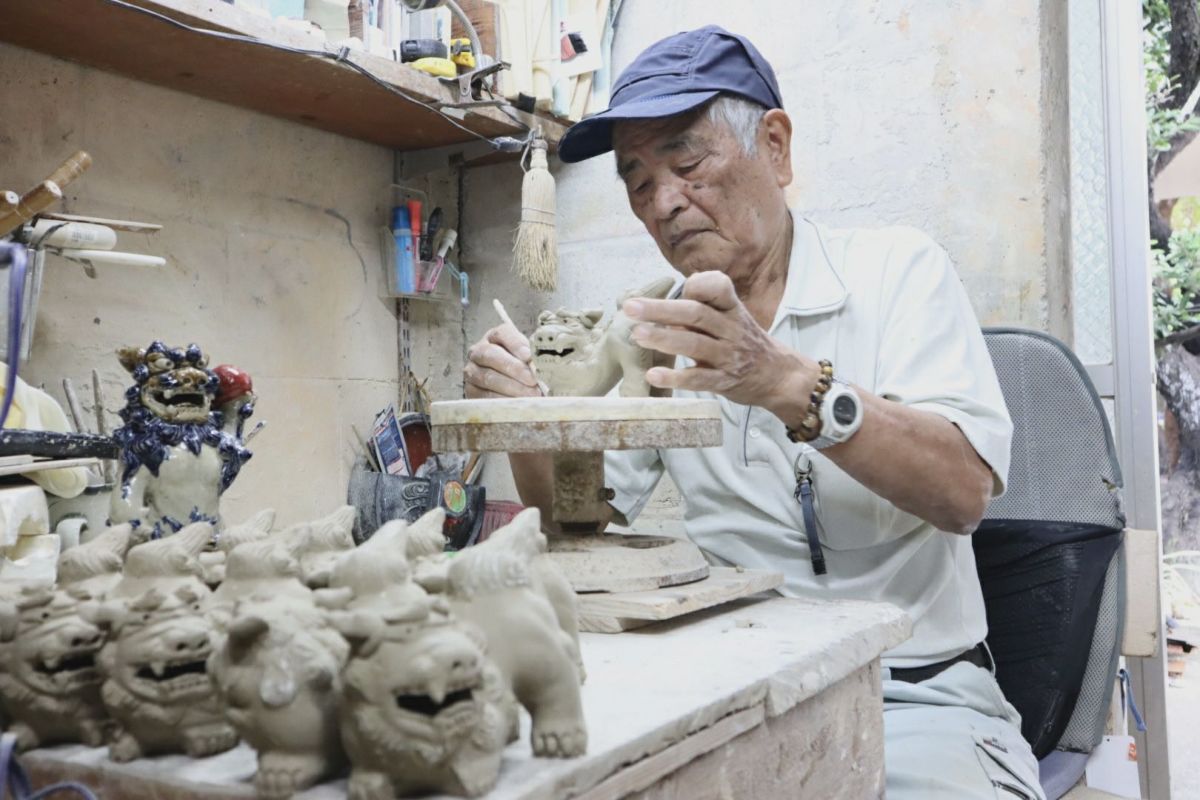 焼き物づくりを始めて60年以上、「もしかすると、沖縄の陶工の中では、僕が一番たくさんシーサーを作ったんじゃないかな」と笑う湧田さん。これまで作り続けてきた定番アイテムのほかに、最近では、親子をテーマにしたシーサーを数多く製作し、人気となっています。