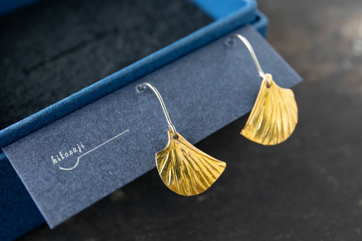 クバは昔から民具などの材料にされてきた植物で、「オージ」とは「扇」のこと。クバの葉でつくる昔ながらの扇の形を金細工で表現しました。クバオージは「よい風を生む」という縁起のよいモチーフでもあり、身に着けるたびに勇気をくれそうな、愛らしいアクセサリーです。