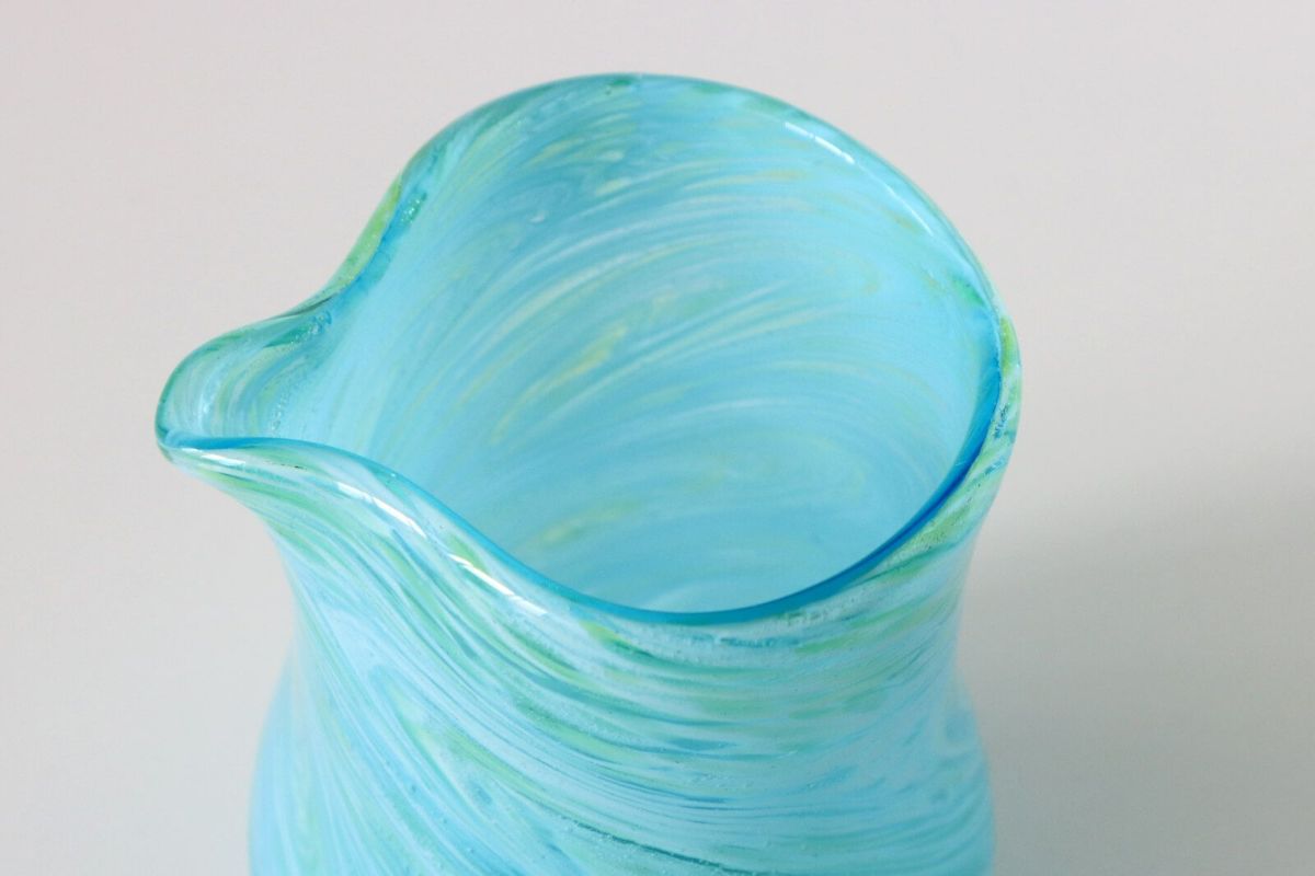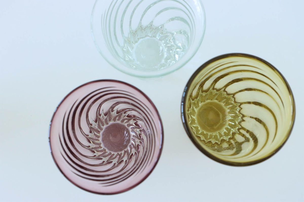 1000度を超える熱で真っ赤に溶けたガラスが鉄のパイプから息を吹き込まれることで様々な色と形へと姿を変え美しい器が生まれます。沖縄の工芸としては比較的歴史は浅く、100年ほど前に製造が始まったとされています。戦前から戦後しばらくの間はランプの火屋(ほや)や駄菓子を入れるビンなど実用品が中心に作られていました。