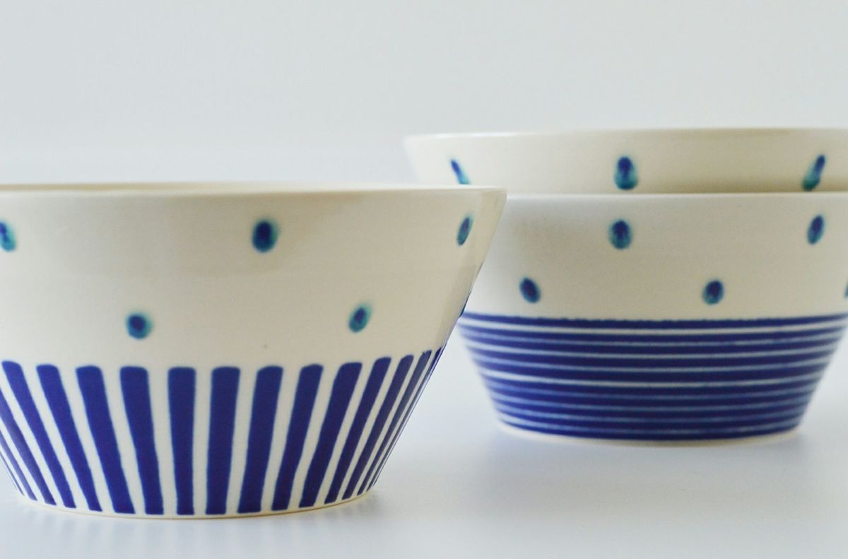 繊細な絵付けと、やちむんでは珍しい磁器のようなツヤのある白色が特徴で、工房の代表作、ドット模様の器のシリーズは和洋食問わず使える人気アイテムとなっています。