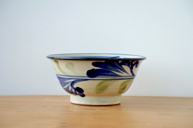 陶眞窯は国の伝統工芸士でもある相馬正和さんが主催する窯元で、壺屋焼の伝統を活かしながら、どこかモダンさも備えたモノづくりを続けています。グリーンとブルーの組み合わせが軽やかで、若夏をイメージさせる絵柄です。