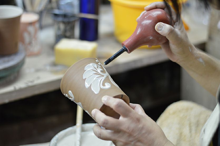 復刻した深緑色の釉薬で唐草を描いた「黒ゴス唐草シリーズ」、線彫り模様と壺屋焼の伝統文様「花ぐー」を組み合わせた「線彫り花ぐーシリーズ」などの生活雑器から、相馬さんが手がける琉球南蛮の作品、獅子や龍のオブジェまで、幅広いジャンルのやきものを制作しています。