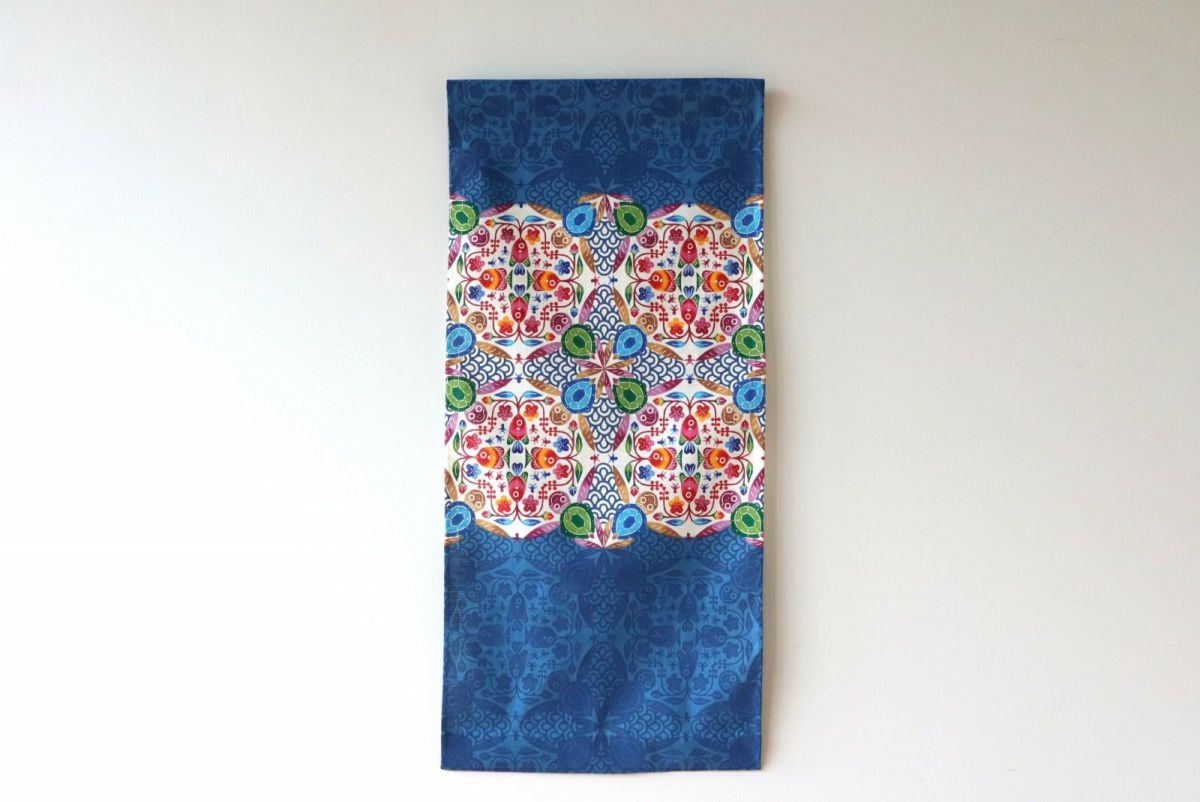 伝統工芸の紅型を、暮らしに取り入れやすいタペストリーにした、お部屋を素敵に彩る一品。天地の青い部分にも細かな染めが施されているので、統一感のあるタペストリーになっています。結婚祝いや新築祝いの贈り物にも。