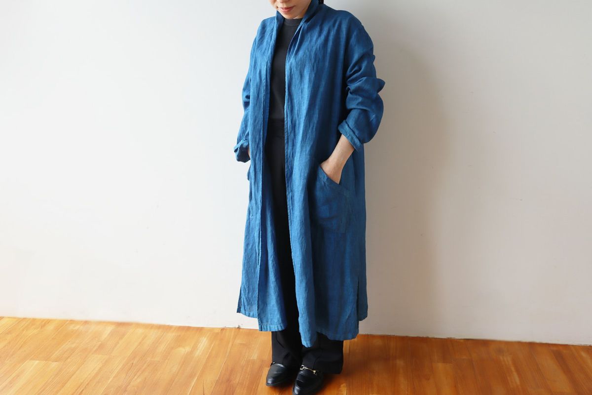 ボタン等もないシンプルなカタチで、羽織るだけでしっかりサマになる力強い服。長く使うことで風合いを増すリネン素材に、自然の色を染めました。思い思いのスタイルで、豊かな魅力をお楽しみください。