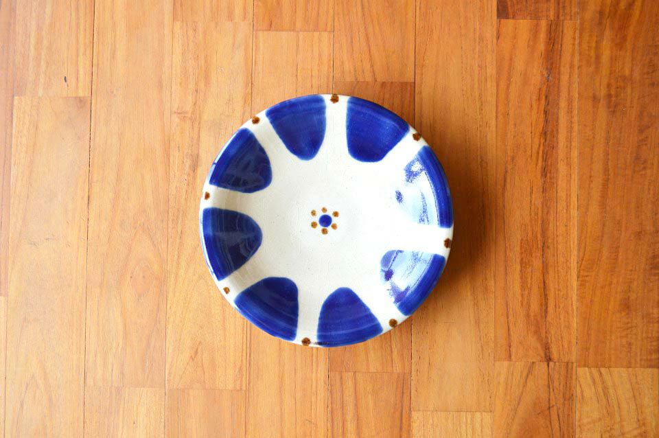 おかずを家族分まとめて盛ったり、カフェっぽいワンプレート料理やカレー皿にもぴったりの七寸サイズ。読谷村にある住まいとつながった工房で、子どもの元気な声を聞きながら日々作陶を続ける野本周さんの陶器です。深くも鮮やかなコバルトでほがらかにに描かれた、意外と見かけることのない個性的なデザインの一枚です。「呉須」とよく似た色ですが、コバルトの方が色味が鮮やかな青です。