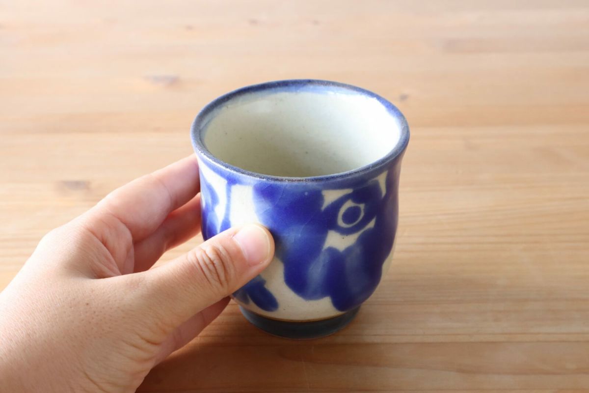 のびのびと大きく描かれた花が可愛らしい。花唐草のシリーズ。お揃いのお皿やカップなどで揃えたいですね。こちらは、なめらかな曲線が手にフィットする、お手頃サイズの湯呑。どことなく洋な雰囲気もあるのでコーヒーや紅茶などを楽しんでも