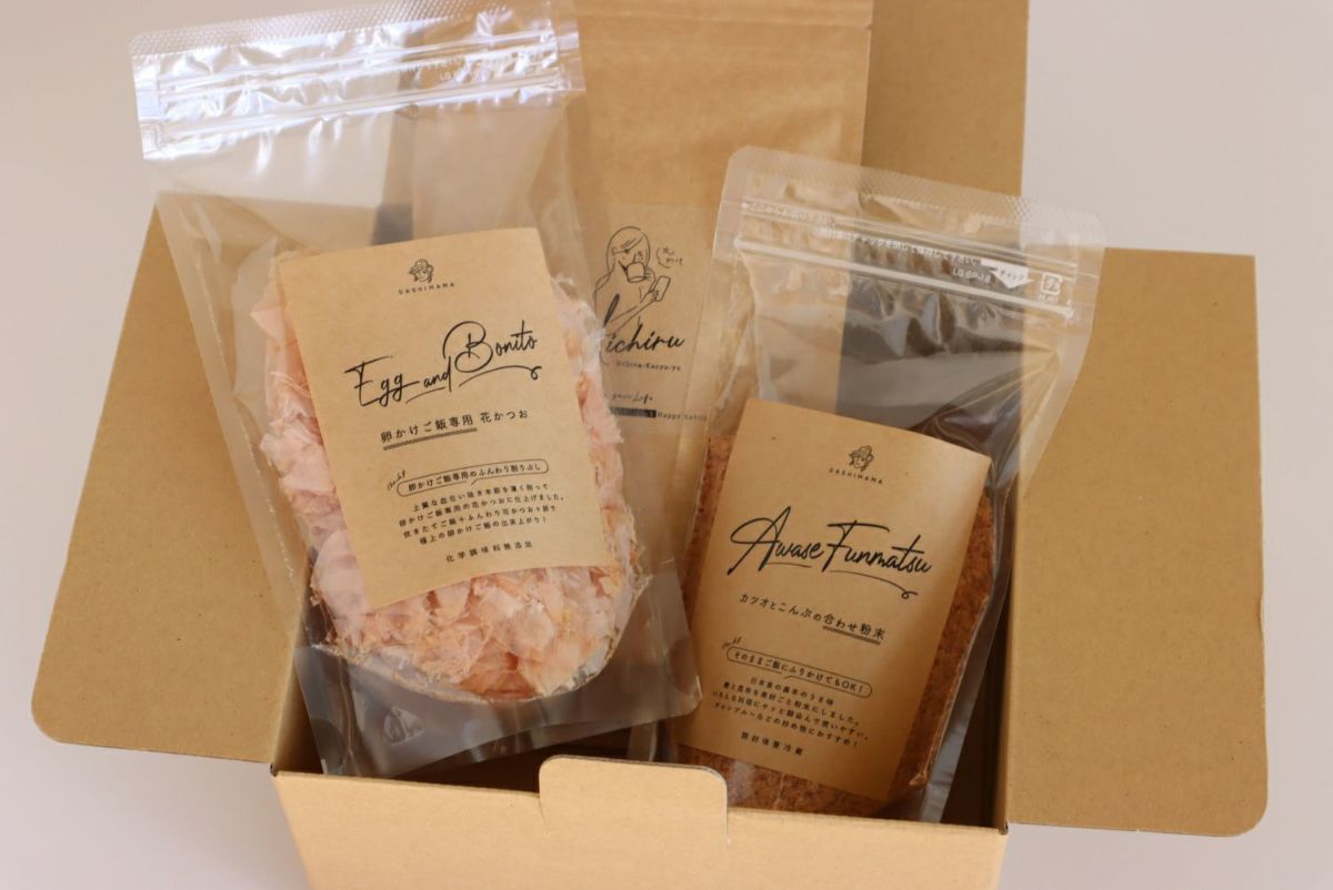 かつての自分と同じように困っている人たちに、「だしの魅力を知って、手軽に楽しんでほしい」という思いから立ち上げたのが自身のブランド「DashimamaOkinawa(だしママおきなわ)」。今回は「鰹と昆布の合わせ粉末」「即席かちゅー湯」「卵かけご飯専用花かつお」をセットでお届け。自然由来の美味を手軽に楽しめる、やさしいギフトです。