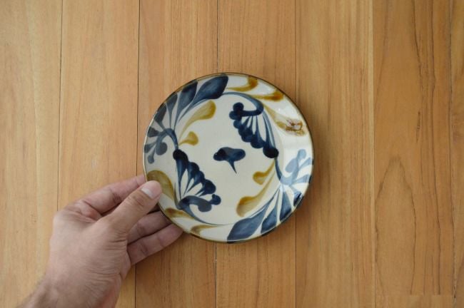取り分け皿にちょうどいいサイズの五寸皿。ケーキやお菓子にもぴったりです。陶眞窯は国の伝統工芸士でもある相馬正和さんが主催する窯元で、壺屋焼の伝統を活かしながら、どこかモダンさも備えたモノづくりを続けています。伝統の唐草柄がキリッとした筆致で勢い良く描かれています。
