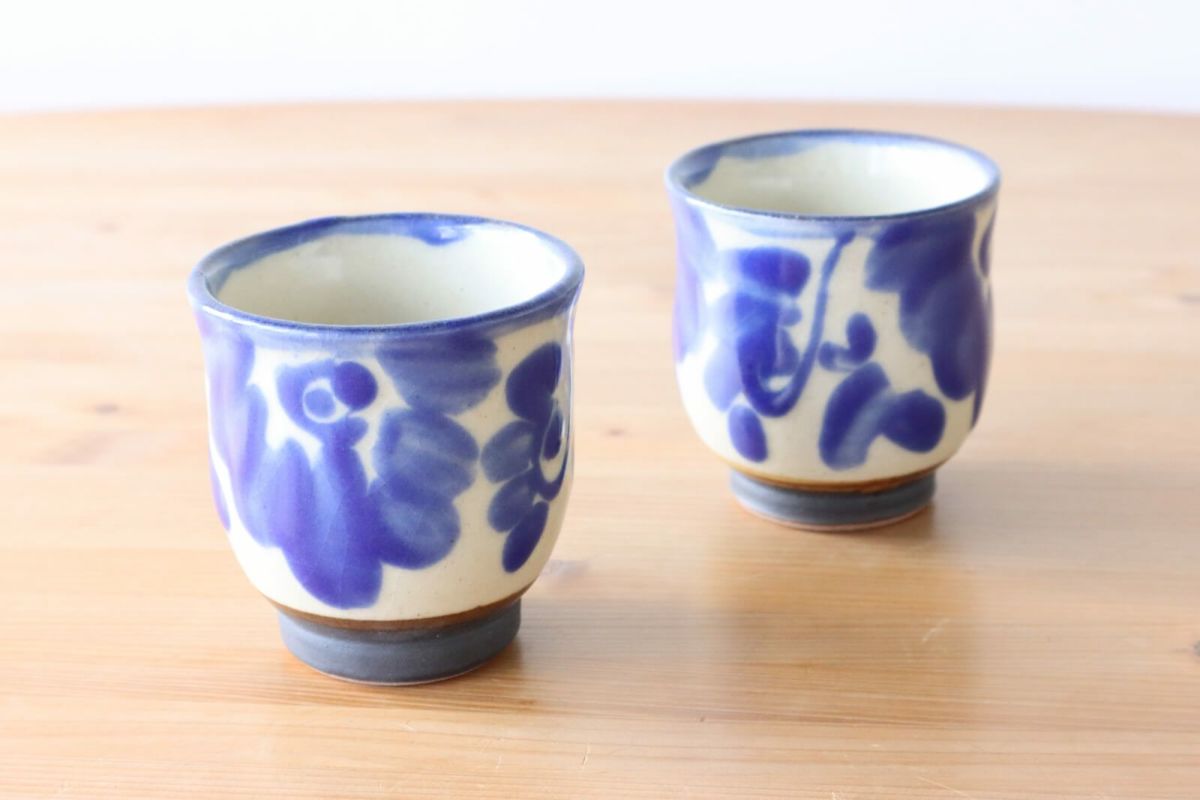 のびのびと大きく描かれた花が可愛らしい。花唐草のシリーズ。お揃いのお皿やカップなどで揃えたいですね。こちらは、なめらかな曲線が手にフィットする、お手頃サイズの湯呑。どことなく洋な雰囲気もあるのでコーヒーや紅茶などを楽しんでも