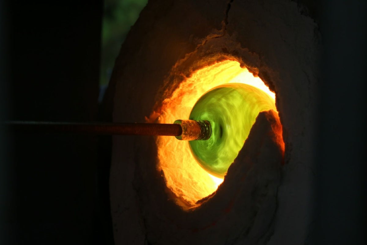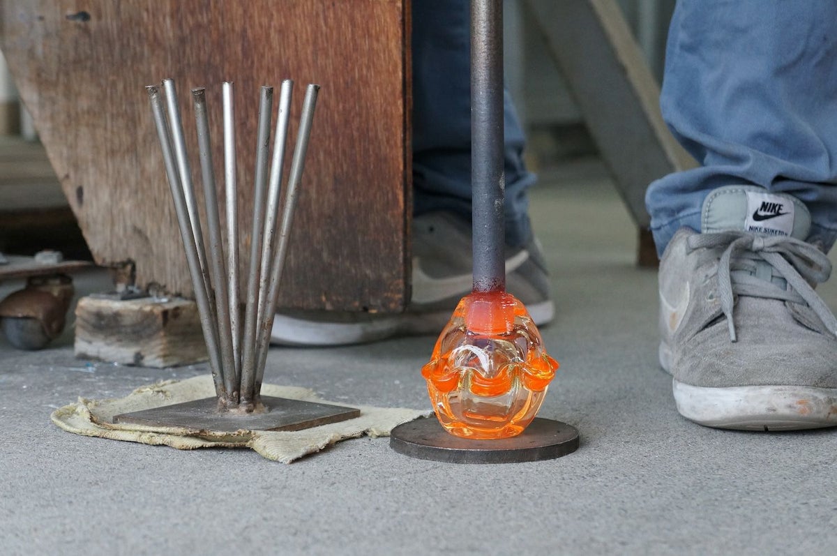 連携プレーの邪魔にならないよう、スタッフの皆さんの動きを読んで、工房内をぐるぐると移動し、立ち位置を確保する。1200℃から1400℃で燃える窯の火は離れたところにいても、熱い。ここから、吹き竿で真っ赤に溶けたタネ(ガラスの原料)巻き取る。そして、ふーっと思い切り息を吹き込むと、みるみるうちに、きれいな球体ができる。この「吹きガラス」と呼ばれる技法はガラス製造の基本であり、発祥は紀元前1世紀頃のローマ。なんと2000年前から今に至るまで、製法はほとんど変わらないというから驚きだ。