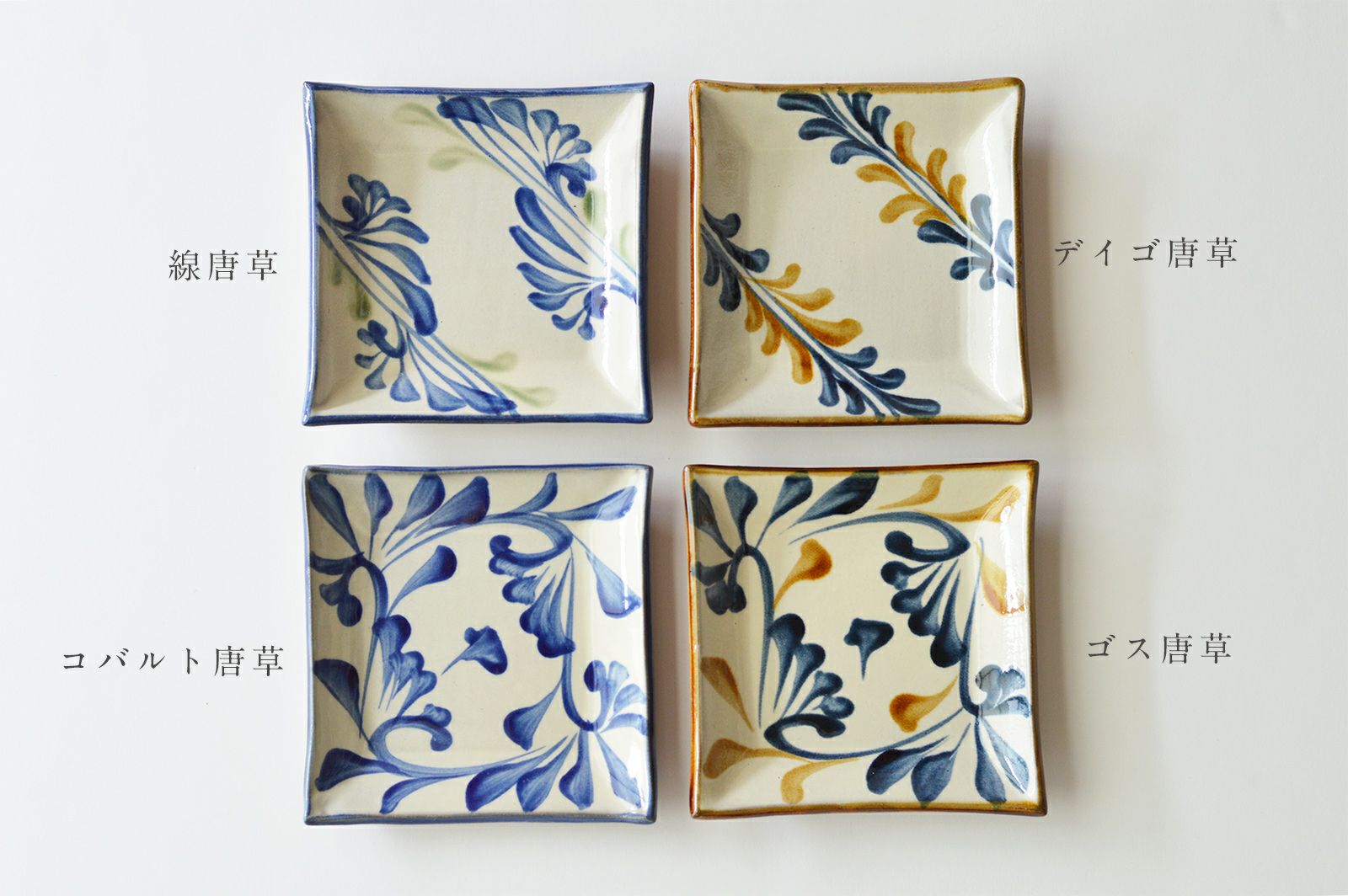 唐草や刷毛目(はけめ)の赤絵など、沖縄の伝統の模様はもちろん、そこから発展した工房独自のデザインとして定番化したものの多くが、20年以上描き続けられているデザインです。