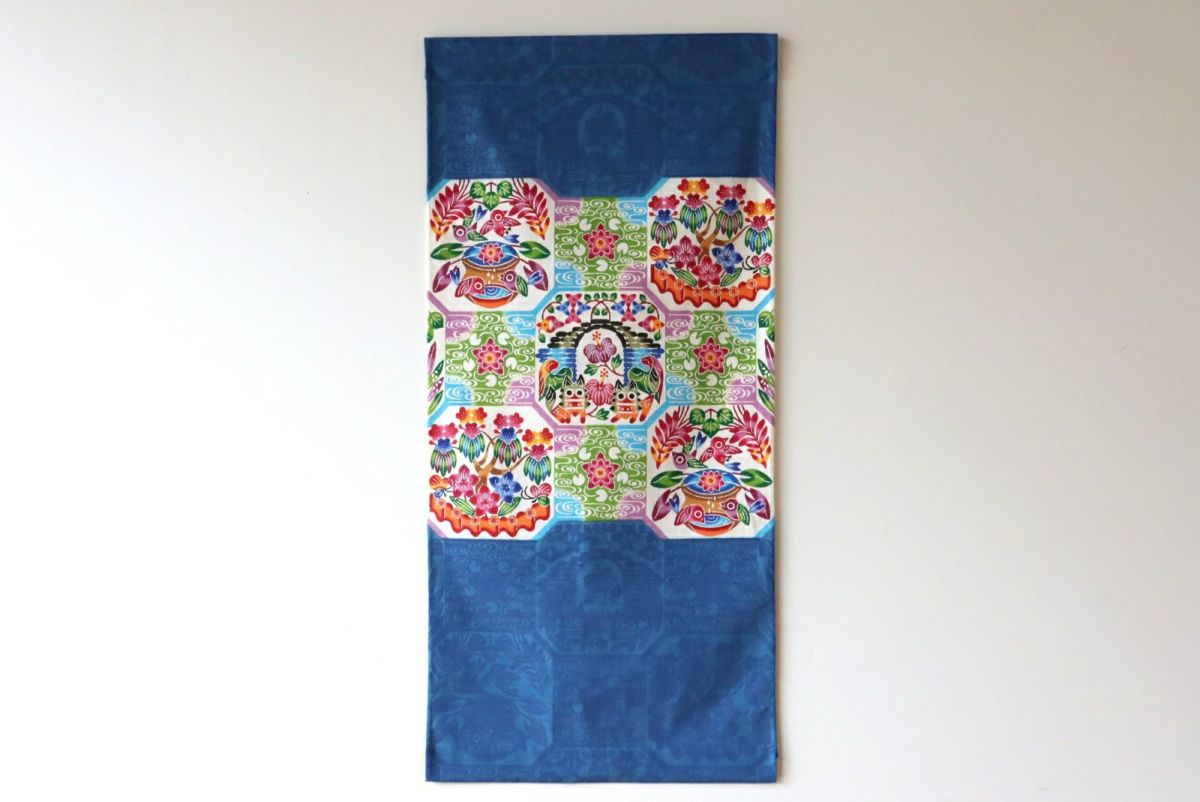 伝統工芸の紅型を、暮らしに取り入れやすいタペストリーにした、お部屋を素敵に彩る一品。天地の青い部分にも細かな染めが施されているので、統一感のあるタペストリーになっています。結婚祝いや新築祝いの贈り物にも。