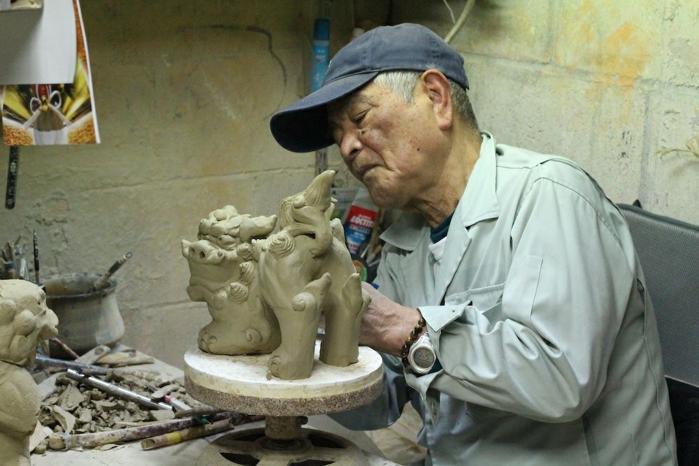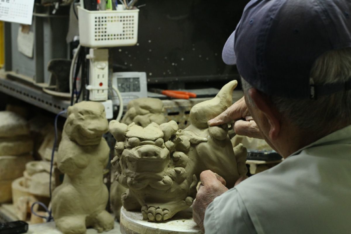 【一点もの】毛手巻座型玉抱親子中シシ / 湧田陶器 湧田弘