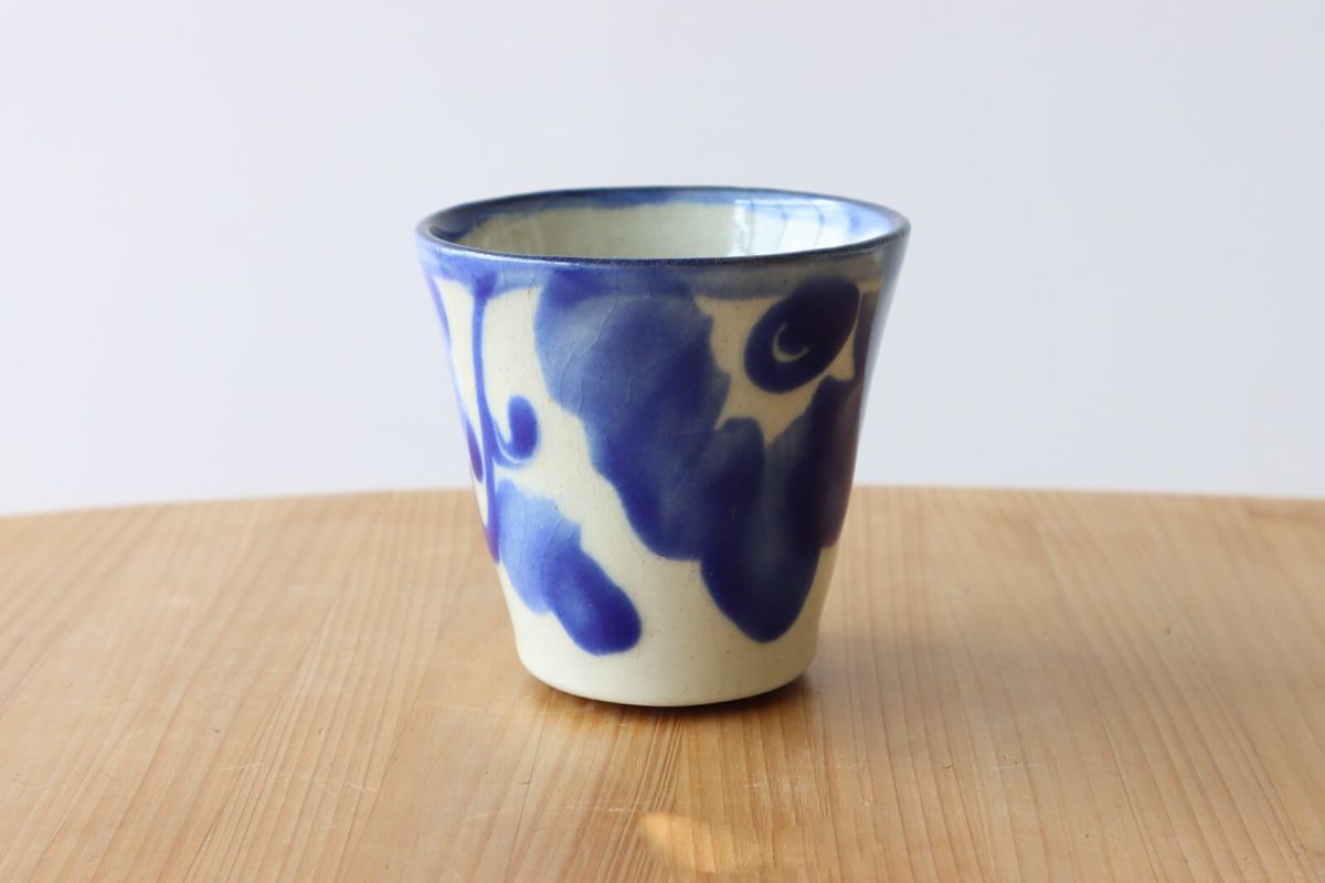 のびのびと大きく描かれた花が可愛らしい。花唐草のシリーズ。幅広い飲み物に使えるフリーカップ。手のひらに収まりよいサイズ感です。