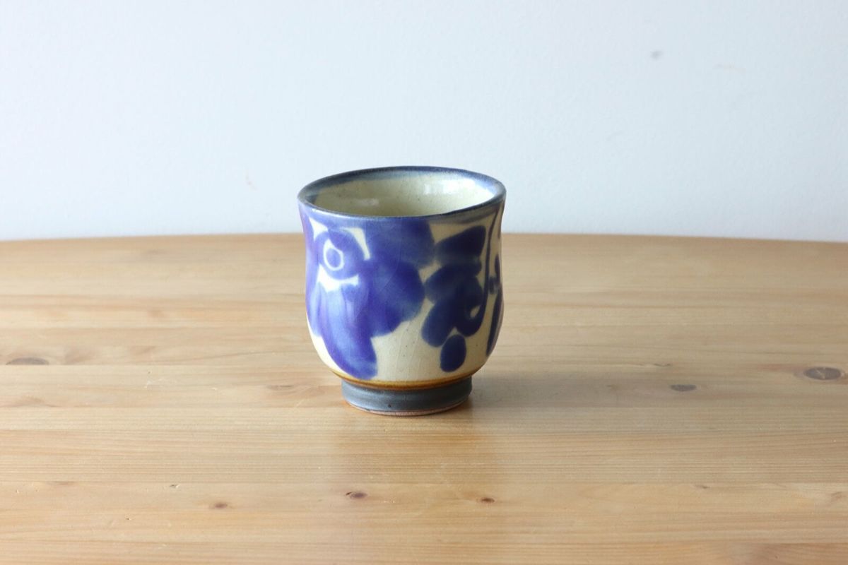 のびのびと大きく描かれた花が可愛らしい。花唐草のシリーズ。お揃いのお皿やカップなどで揃えたいですね。こちらは、なめらかな曲線が手にフィットする、お手頃サイズの湯呑。どことなく洋な雰囲気もあるのでコーヒーや紅茶などを楽しんでも